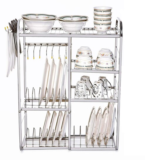Meded 24" inch stainless steel rack features ample space for plates, bowls, glasses. spoons & cutlery and serving dishes. Product Features Holds ample plates or bowls and has several slots to accommodate cutlery Stainless Steel construction with attractive chrome plating for durability and a sleek look.