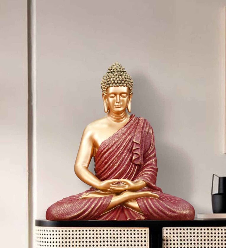 Meditating Buddha Idol Polyresin Red and Bronze Water Resistant