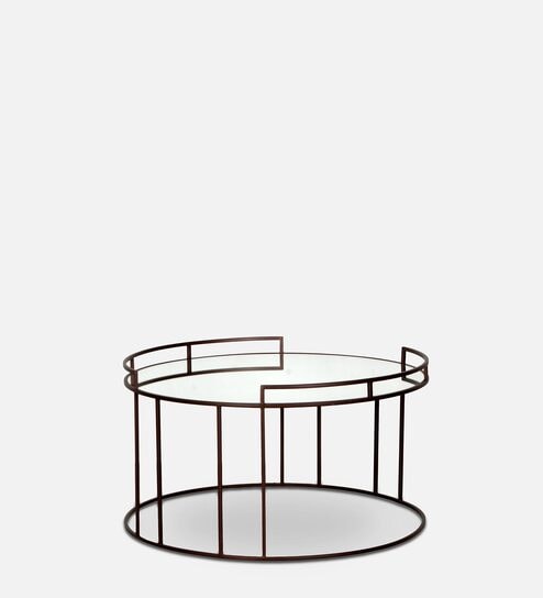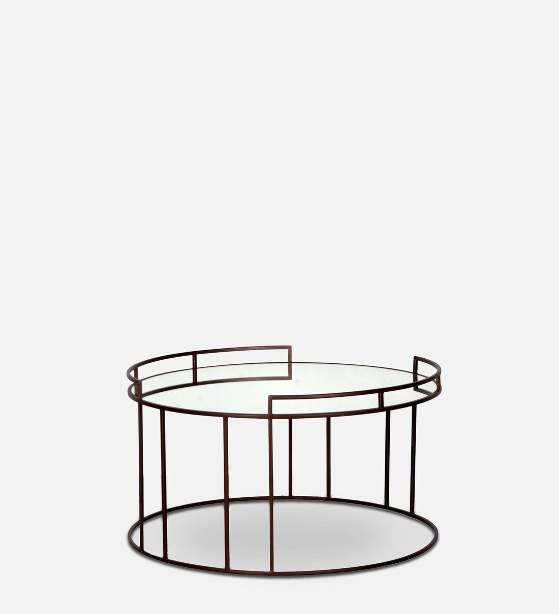 Featuring an open, almost geometric base in iron, this contemporary round coffee table includes a 10mm mirror tabletop. A stylish addition to any seating area, a bronze frame finish adds a touch of glamour.