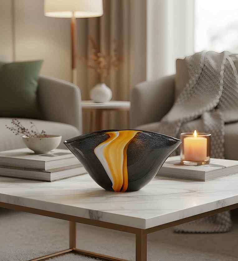 This striking statement piece features a bold, deep black glass body that exudes modern sophistication. Running gracefully along its surface is a single, elegant vertical wave rendered in a luminous yellow-gold hue. The contrast between the dark, reflective glass and the radiant wave creates an eye-catching balance of drama and refinement. Perfect for contemporary interiors, the Eclipse Wave Vase serves as both a functional vessel and a work of art, effortlessly enhancing any space with its unique blend of minimalist design and luxurious detail.