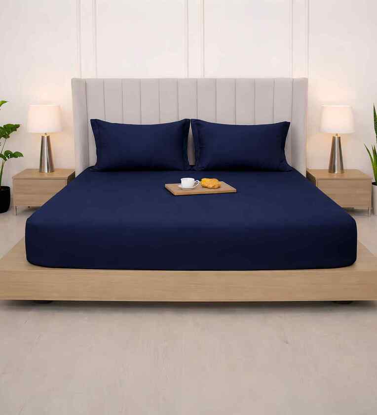 Midnight Navy Solid 300 TC Pure Cotton King Fitted Bedsheet with 2 Pillow Covers