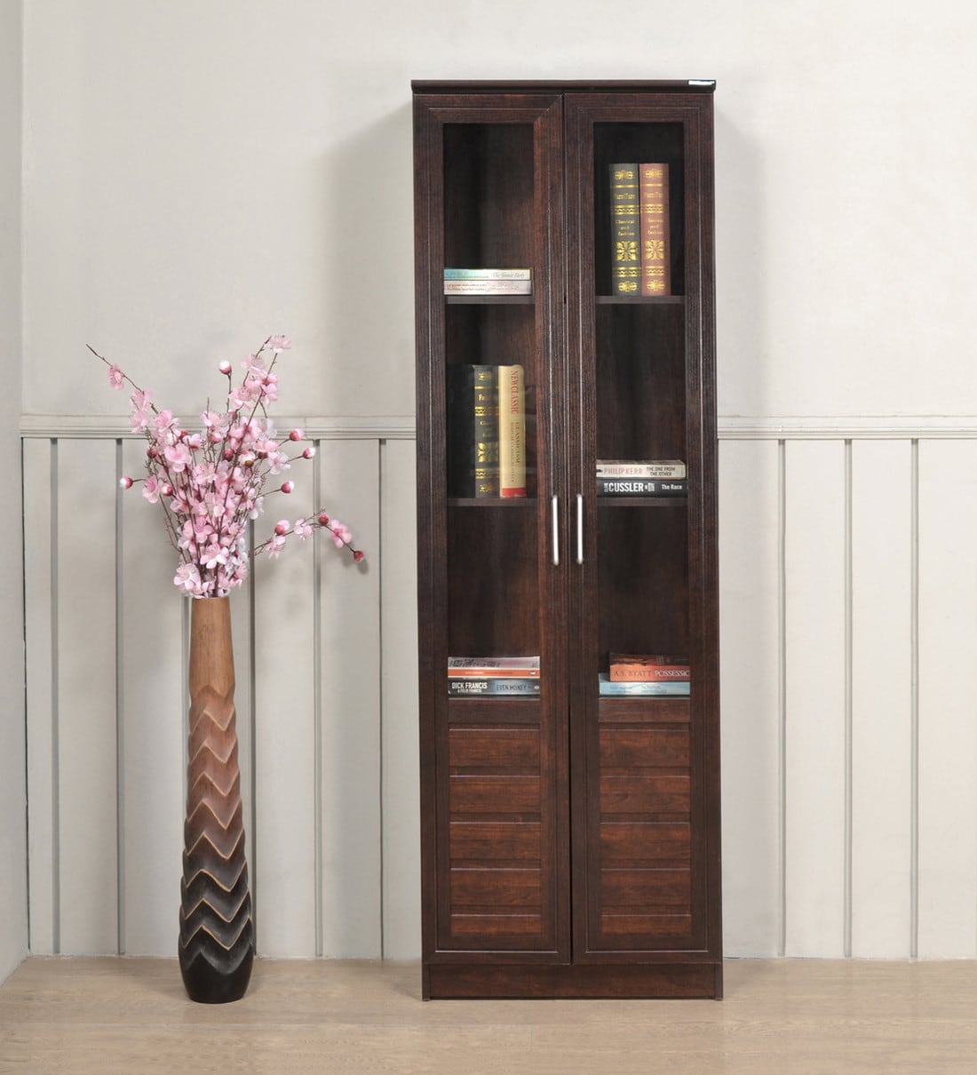 Top and side panel along with shelf made of 15mm thick particle board. Back panel made of 3mm thick MDF. It has shutter glass door with 4 shelves.