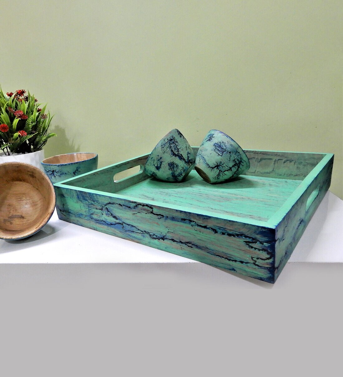 Serving Tray with 4 bowls, Wooden burn affects and distress wood mint Blue polish Combo