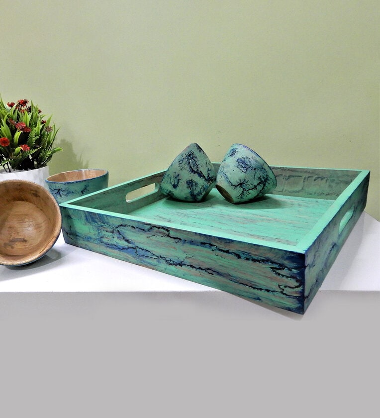 Mint Blue 100 m Handpainted Wood 4 Pcs Bowls With Serving Tray