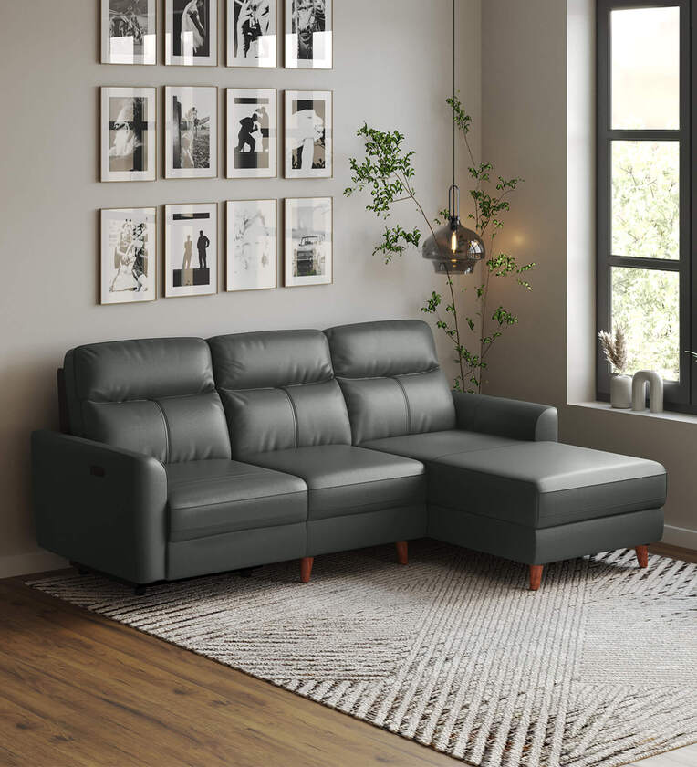 Recliner controlled by touch of a button to any reclining position for personalised comfort. Operated via motor which needs power connection. Touch Recliner at one end and chaise at the other end with stagnant middle seat. Also has provision of USB Port for mobile charging. The smooth reclining offers effortless relaxation, allowing you to transition seamlessly from sitting to lying down. With a gentle push, the backrest and footrest adjust to your desired position, providing ultimate comfort and support. The sofa offers generous lumbar support, which engulfs your entire back area. The high backrest with head support offer excellent support for your back, shoulders, and arms, encouraging healthy postures and delivering superior comfort for extended sitting sessions. Leather stays cool in summer and warm in winter. This maintains a comfortable temperature which actually increases its elasticity. This recliner has black powder coated metal reclining mechanism of superior quality and durability. The rubberwood legs enhances the looks with impeccable strength which can withstand rough usage.