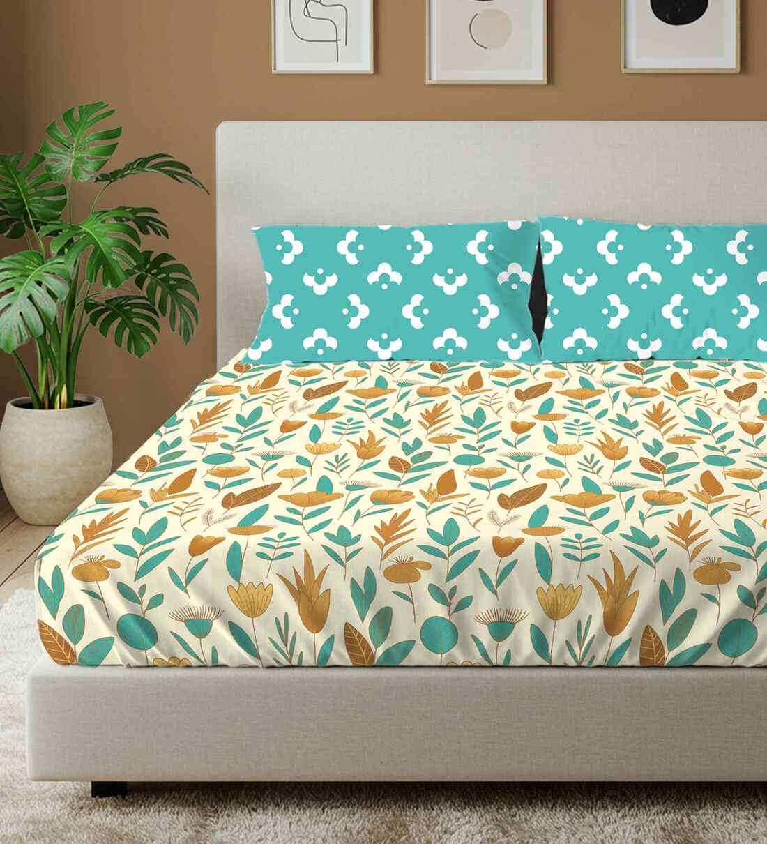 Mist Teal Blue Floral 144 Tc Cotton Double Bedsheet With 2 Pillow Covers