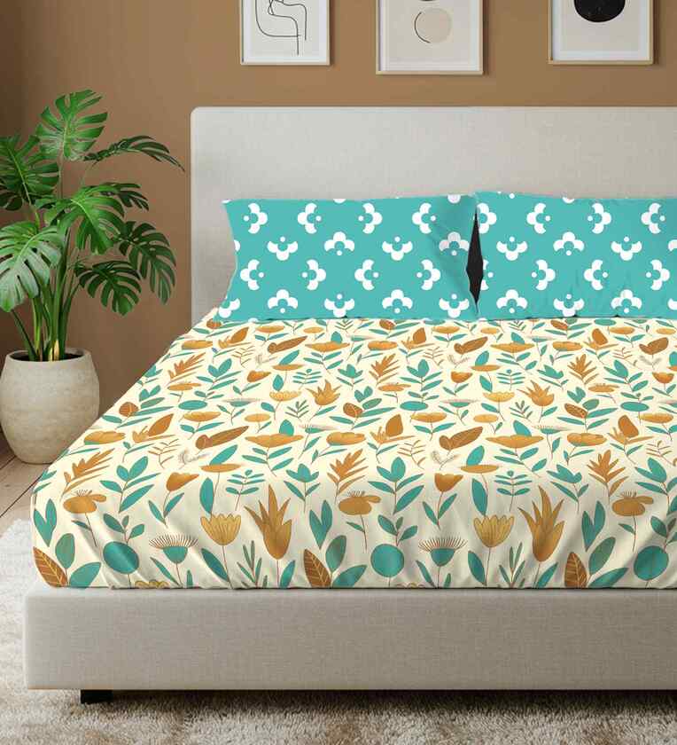 Mist Teal Blue Floral 144 Tc Cotton King Bedsheet With 2 Pillow Covers