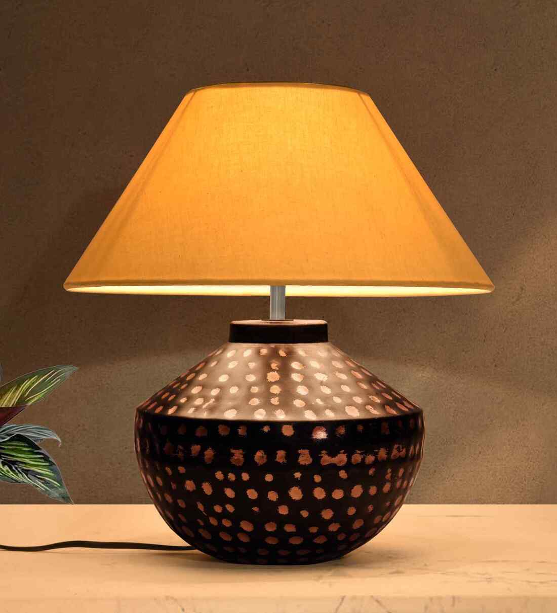 Enhance your space with this modern decorative table lamp, featuring a stylish fabric shade and a durable metal base with intricate dotted patterns. ideal as a bedside lamp, night lamp, or study lamp, it provides warm, ambient lighting for bedrooms, living rooms, or offices. Equipped with an E27 bulb holder, a two-pin plug, and an on/off switch with ( bulb included) it ensures convenience and reliability. This home d cor lamp blends elegance with functionality, table lamp, Dining Room, Bedroom, Living Room, Bar, Restaurants, Study Room, Aisle, Corridor, Coffee Shop, or accent lighting, kids' room, offices, and more. Perfect for any setting.
