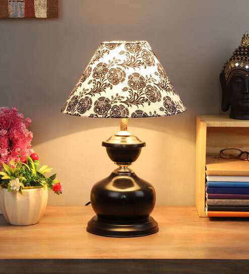 Modern Black Metal Table Lamp with Filigree Print Shade