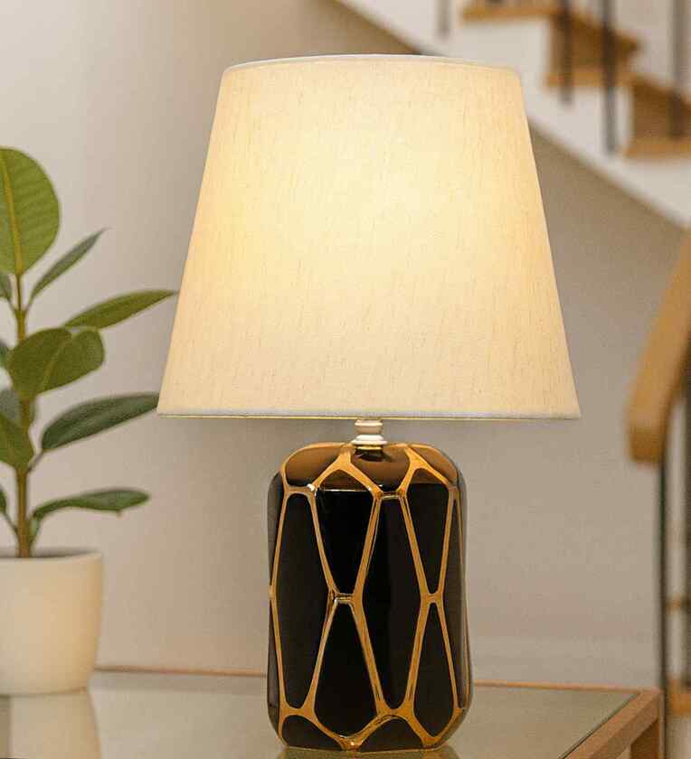 Bring a touch of sophistication to your interiors with this modern black ceramic table lamp, featuring a bold gold geometric base paired with a classic black tapered fabric shade. it includes a durable E27 holder, 2-Pin Plug with ON/ OFF Switch, (bulb not included) and supports LED bulbs. Designed to cast a warm, inviting glow, this lamp is perfect for bedrooms, living rooms, or office spaces. Its durable ceramic construction and premium finish make it not just a source of light but also a statement d cor piece that elevates any modern or contemporary setting.