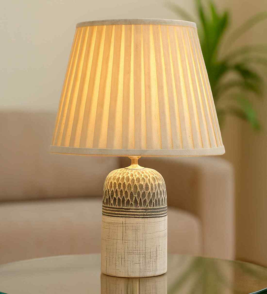 Bring a refined rustic charm to your home with this ceramic table lamp, featuring a handcrafted textured white base with carved detailing and a black fabric shade. The lamp emits a warm, inviting glow that enhances the ambiance of bedrooms, living rooms, or workspaces. it includes a durable E27 holder, 2-Pin Plug with ON/ OFF Switch, (bulb not included) and supports LED bulbs. With its balance of rustic artistry and modern elegance, this lamp serves as both a functional lighting solution and a stylish d cor piece. Durable and timeless, it s the perfect addition to homes with farmhouse, bohemian, or modern rustic interiors.