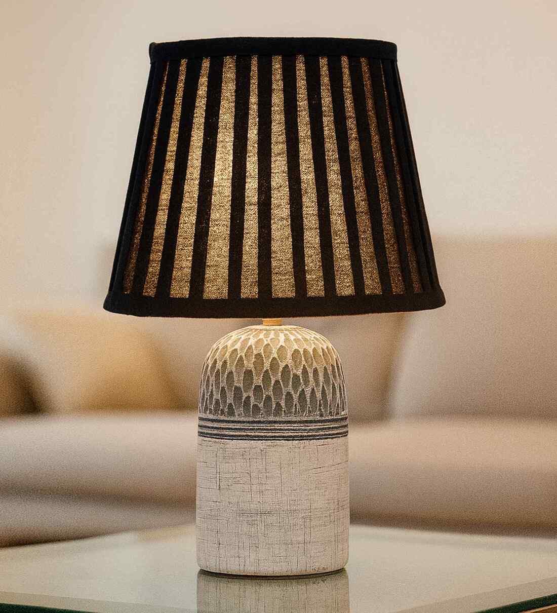 Bring a refined rustic charm to your home with this ceramic table lamp, featuring a handcrafted textured white base with carved detailing and a black fabric shade. The lamp emits a warm, inviting glow that enhances the ambiance of bedrooms, living rooms, or workspaces. it includes a durable E27 holder, 2-Pin Plug with ON/ OFF Switch, (bulb not included) and supports LED bulbs. With its balance of rustic artistry and modern elegance, this lamp serves as both a functional lighting solution and a stylish d cor piece. Durable and timeless, it s the perfect addition to homes with farmhouse, bohemian, or modern rustic interiors.