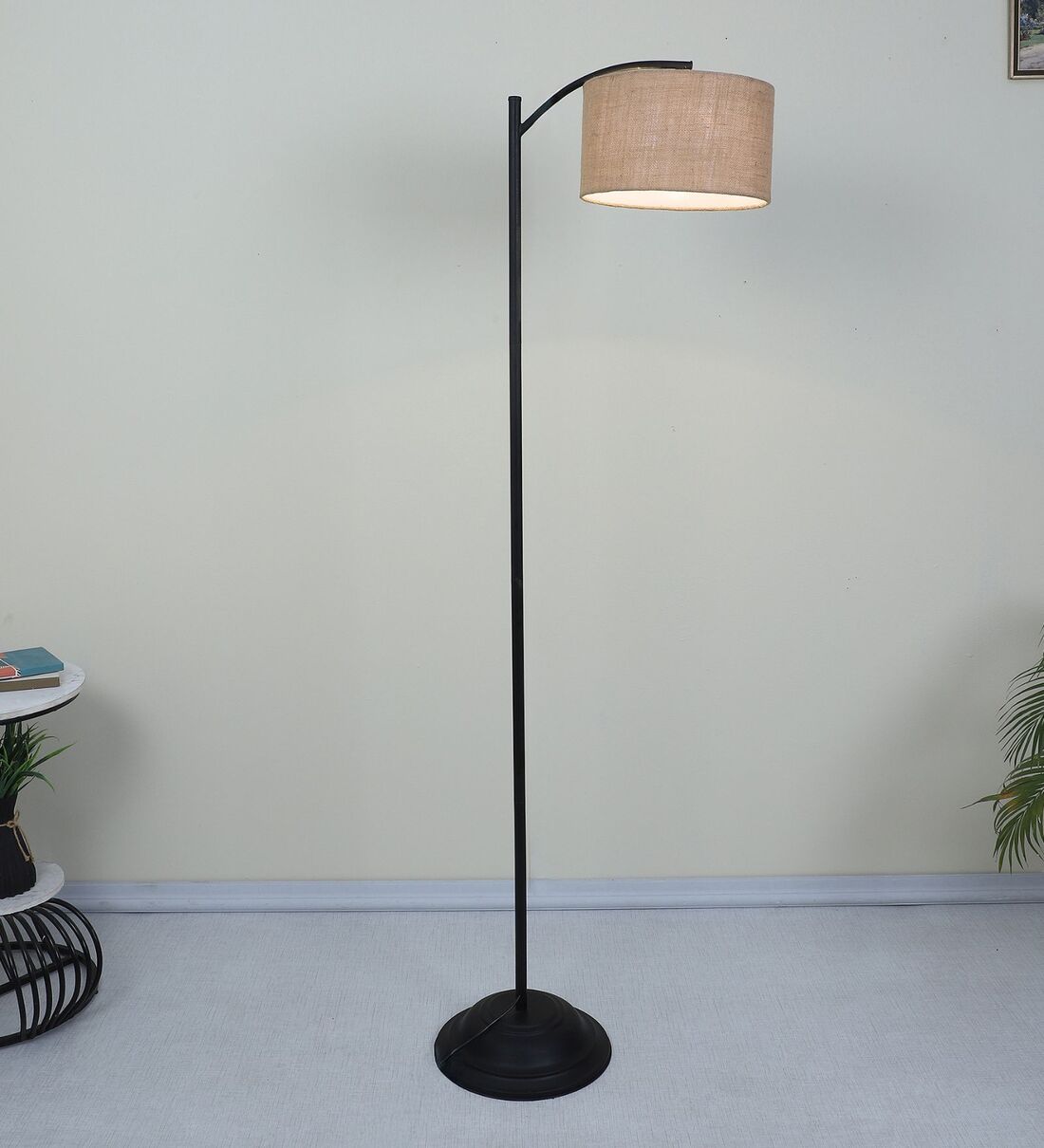 Modern Lamppost Style Black Iron Base Floor Lamps Beige Jute Shade