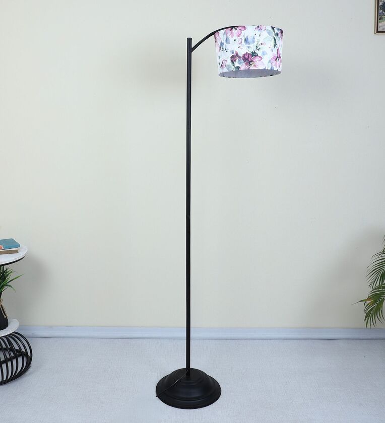 Modern Lamppost Style Black Iron Base Floor Lamps Cobra Saffron Print Satin Shade