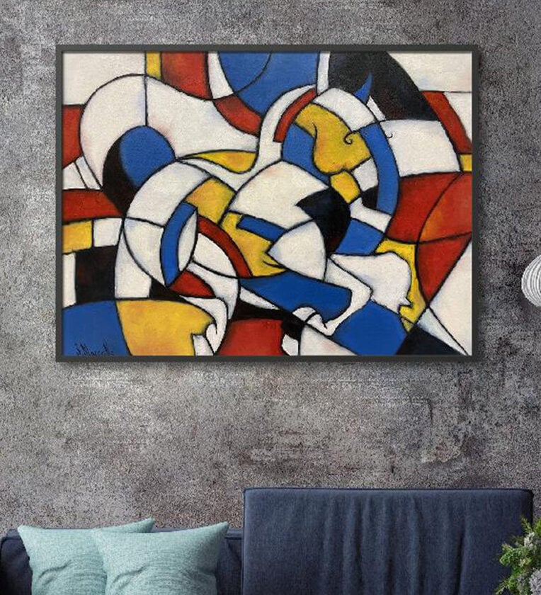 Framed wall art titled: Pete Mondrians Horse. Finished Size: 19 X 15 inches. Print Surface: Canvas. Print Size: 18 X 14 inches. Frame: Slate Black (0.78 inch).