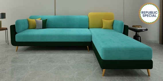 Montez Velvet LHS Sectional Sofa (3 + Lounger) in Turquoise & Green Colour