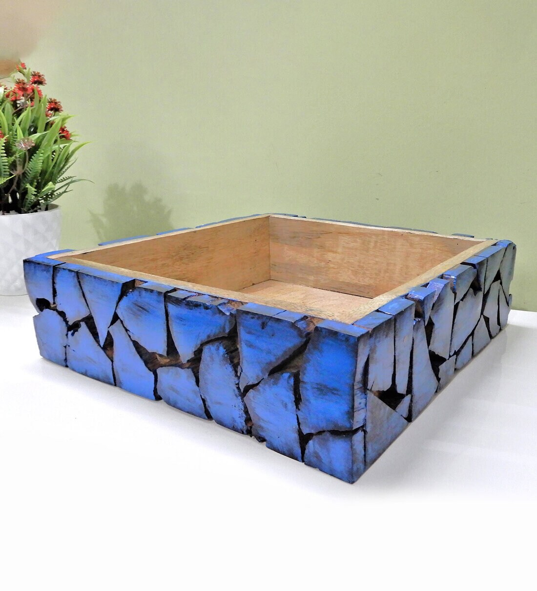 Wooden Blocks mosaic pattern Tray cum table organizer or fruit basket distressed antique looks serving tray viintage blue color