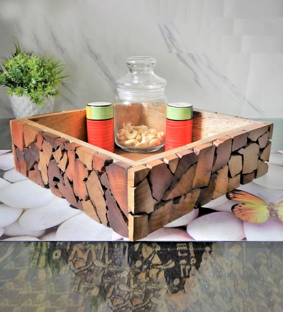 Brown color wooden burnt rustic finese Mosaic Pattern serving tray table organizer Big size