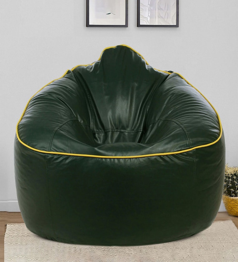 Muddha Leatherette Bean Bag with Beans in Yellow Piping & Dark Green Colour