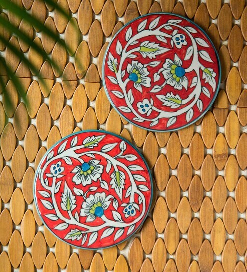 Mughal Rounds Floral Red & White Ceramic (Set of 2) Trivet