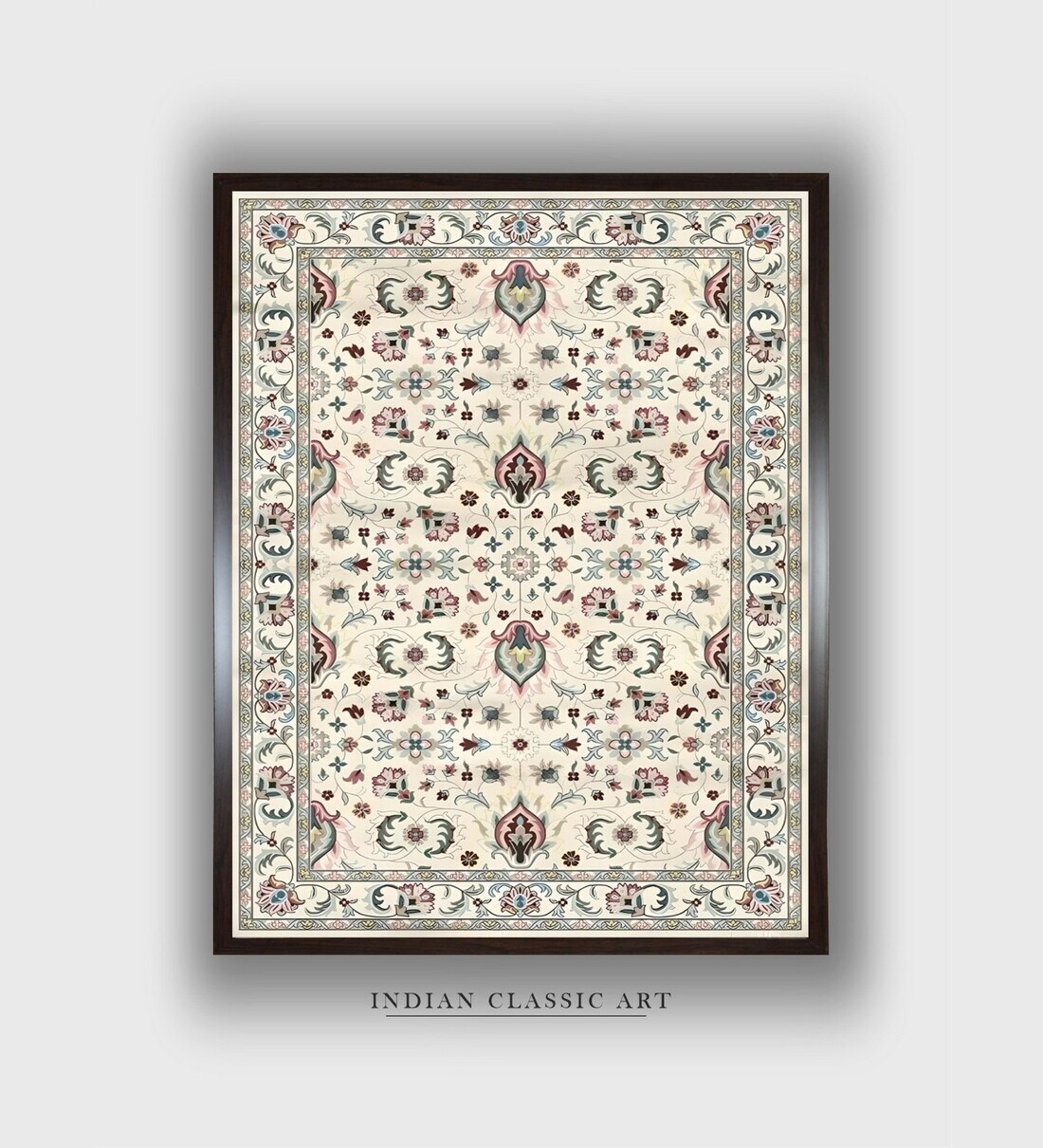 INDIAN CLASSIC ART Beige Blue Mughal Floral Printed Framed Wall Art