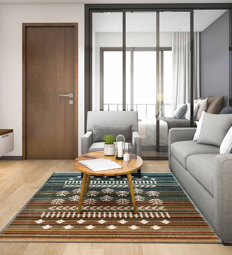 Inspired by the ancient Moroccan city of Fez, this collection brings an artistic flair to your home with its tribal designs and intricate patterns. The FEZ FZ-06 rug features a captivating blend of earthy tones, with stripes in varying shades of blue, green, and brown, complemented by stylized trees and geometric shapes. Crafted from high-quality Frieze material, it offers a plush, soft texture underfoot and is finished with short fringes that enhance its artistic appeal, adding both comfort and a touch of luxury to your space. Material: Frieze Luxurious, soft, and durable frieze fibers mimic the feel of wool. The dense pile creates a plush, inviting surface. Features: Tribal designs enhances your home decor, short fringes give a sleek look. Stain-resistant for practical everyday use. Different Uses: Perfect for living rooms, bedrooms, dining areas, or hallways. Add style and comfort to any space. Durability: Built to last with fade, shred, and stain-resistant fibers. Ideal for high-traffic areas.