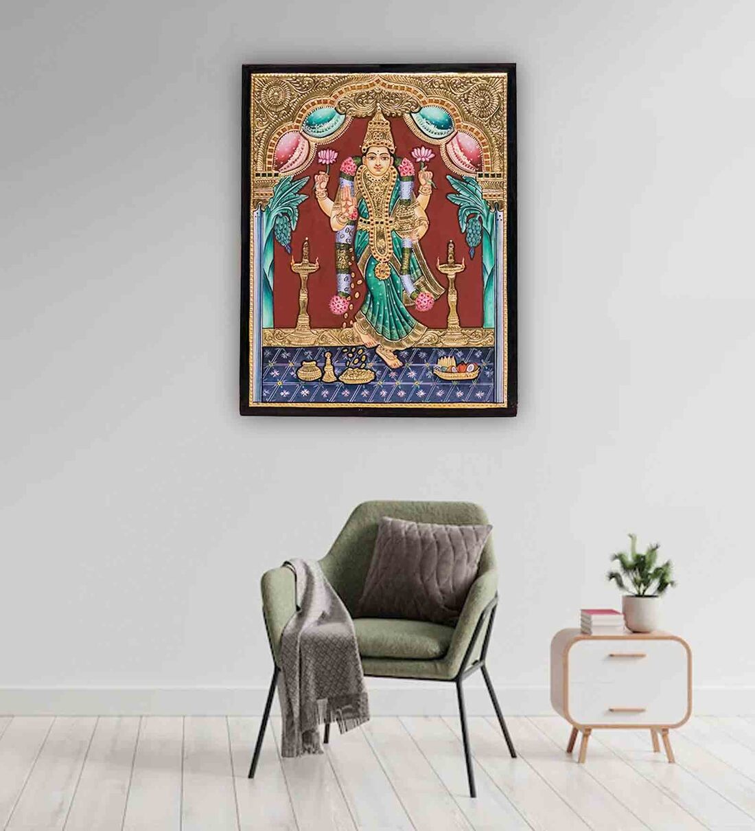  Goddess Lakshmi is the goddess of wealth, fortune, love, beauty, joy and prosperity. This Grahalakshmi Antique Tanjore Painting is made by high quality 24 carat gold foil and authentic Jaipur gems. Crafted by skilled artisans in Thanjavur, this painting is 100% handmade. They are characterized by rich, flat and vivid colors with simple iconic composition.  This Grahalakshmi Antique Tanjore Painting can be used as pooja room paintings, to decorate the walls of temples, palaces and homes. It's made using unique handmade paints on plywood and comes with a 25 years warranty card. You can also customize the size and the frame of the painting according to your specifications.  Tanjore paintings are classical south Indian painting style, that originated from Tanjore in Tamil Nadu back in the 17th century. These paintings are characterized by their rich and vivid colors, simple iconic composition, glittering gold foils overlaid on delicate but extensive gesso work and inlay of glass beads and pieces or very rarely precious and semi-precious gems. They essentially symbolize ancient themes of traditional gods and goddesses.  Tanjore paintings are believed to be auspicious and preserved as valuable antiques. The paintings are painted by expert artisans who empathize on precision and detail. These paintings make your walls beautiful and gives it a royal touch. Also, they are an ideal gifting option for any occasion.