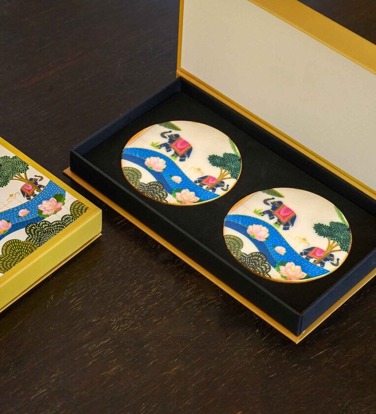 Introducing the "Riverside Reverie" Coaster Set: featuring intricate elephant motifs and delicate lotus designs, capturing the essence of our nation's heritage. Inspired by the artistry of Kantha embroidery and Pattachitra artform from West Bengal and Odisha, India, this set brings a touch of cultural elegance to your home d�cor.