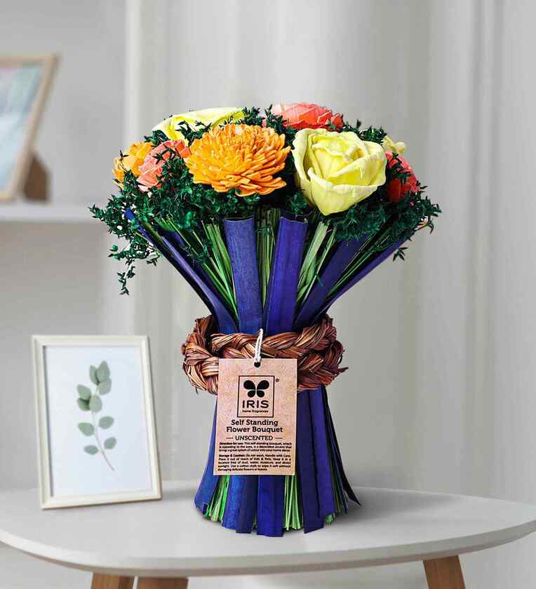 Iris Self-Standing Bouquets, a floral collection that stands tall and elegant on its own. These bouquets feature meticulously handcrafted arrangements of multicolored unscented flowers, showcasing their beauty in a dry flower form. The unique aspect of these bouquets is that they require no maintenance, and they retain their natural color, shape, and texture, providing a long-lasting display of beauty that will remain vibrant for an extended period of time.