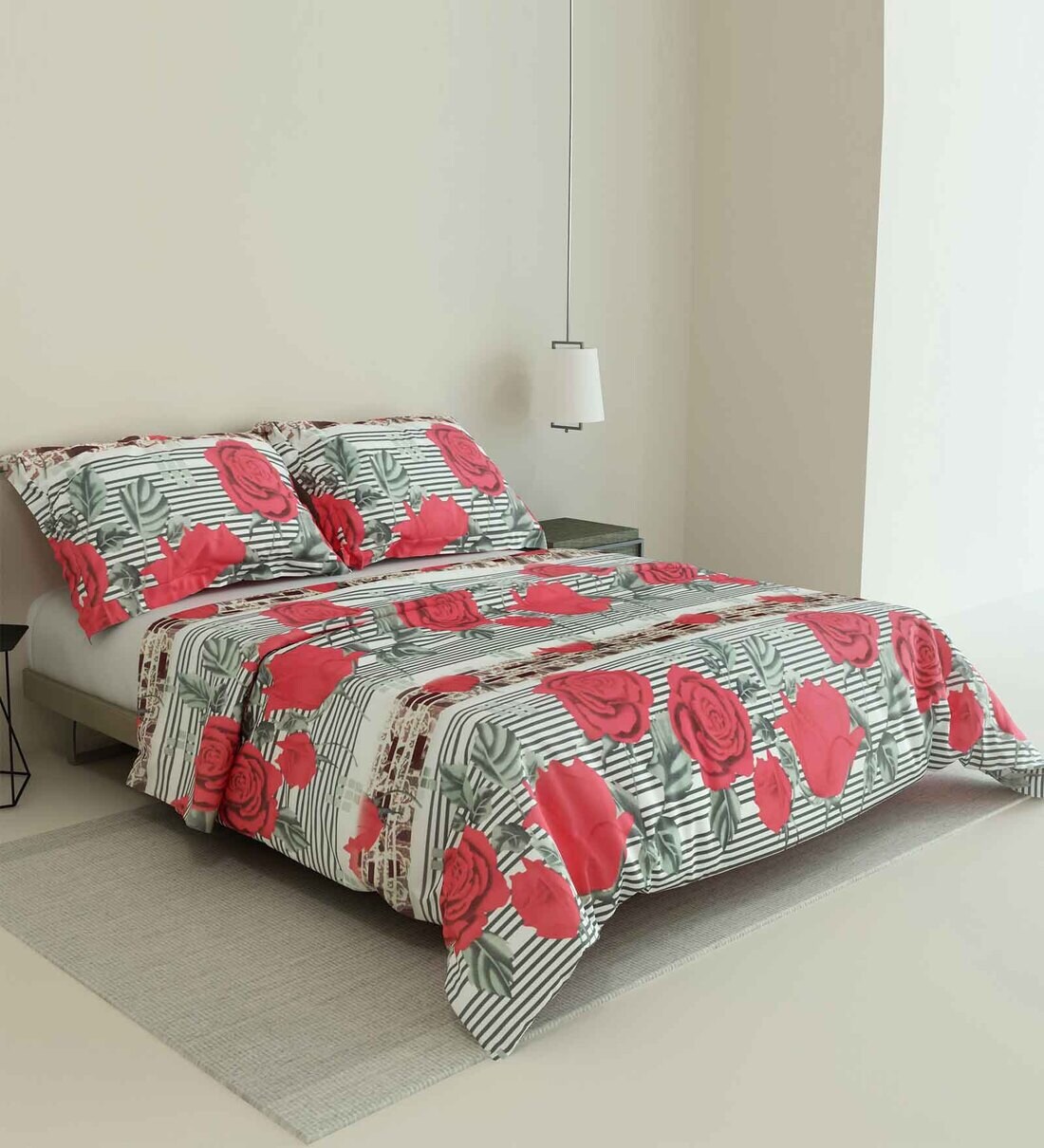 Red and White Floral 180 TC Cotton Queen Sized Double Bedsheet with 2 Pillow Covers