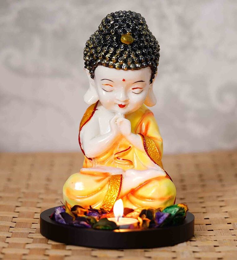 Multicolour Polyresin Praying Orange Monk Buddha with Wooden Base