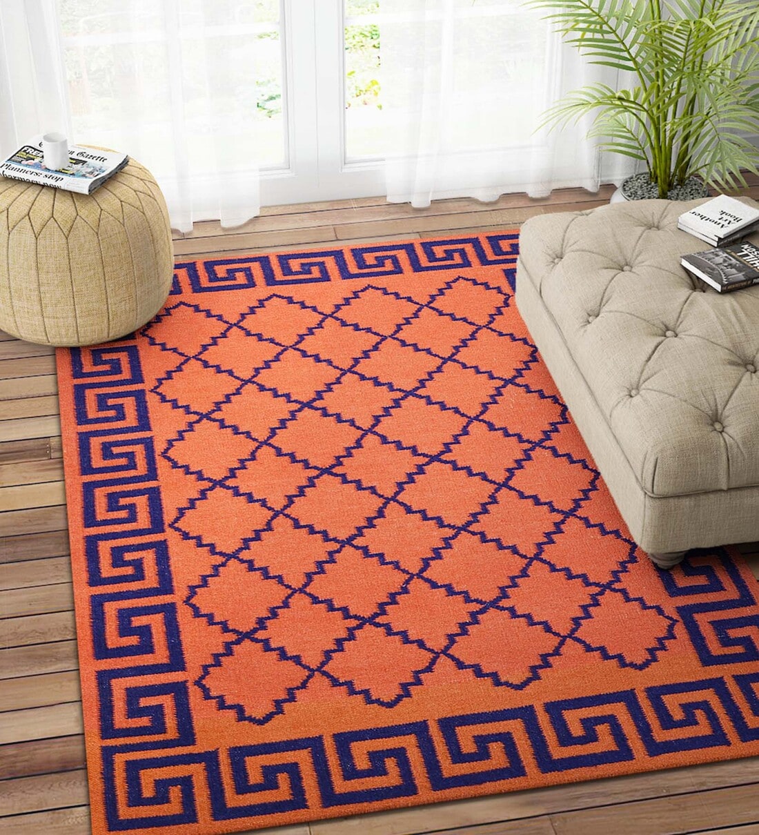 Orange Wool 5 ft X 8 ft Hand Woven Dhurrie
