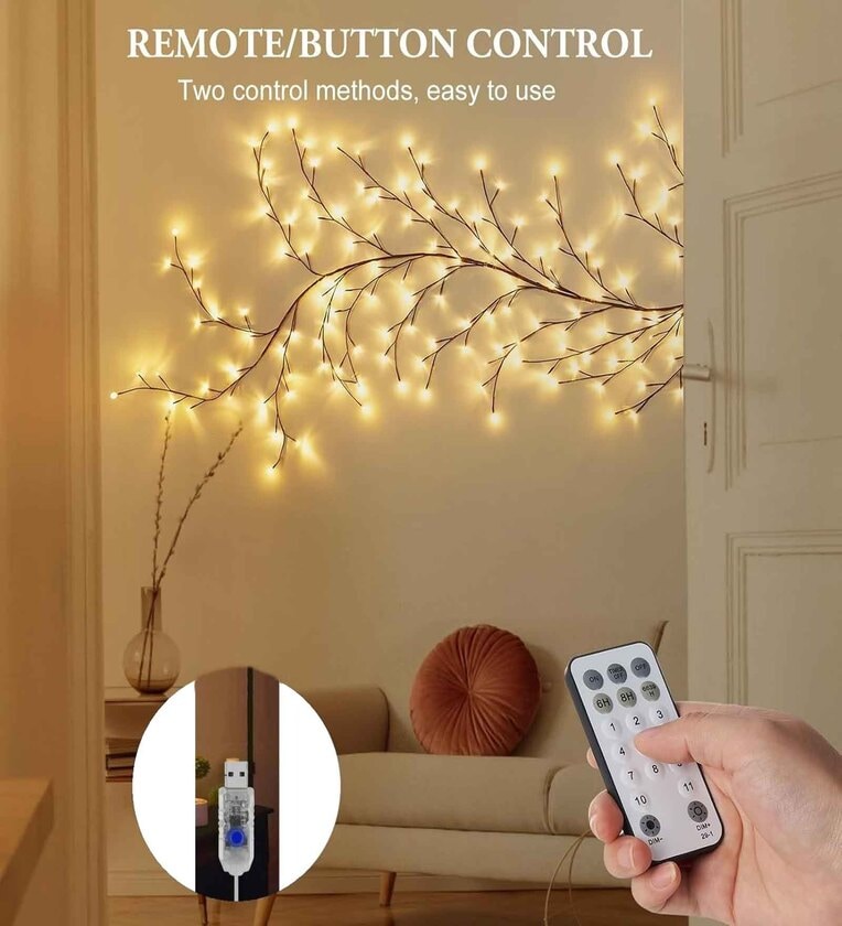 LIGHT UP WALL DECOR: The enchanted willow vine light is approximately 7.5 feet long, with 144 LED lights evenly spaced on 18 branches, the faux brown with textured vine decoration blends naturally into different styles of rooms, and the warm white light adds a touch of magic to any room.REMOTE CONTROL: LED tree branch lights comes with a remote control with a 4-hour timer, 4 lighting modes, and 2 brightness adjustments for you to choose from. Using the remote control aligned with the adapter, you can easily switch between modes and adjust the brightness to meet your needs to add ambience to your surroundings during different festivals.DIY Decorative Vine: The willow vine light decoration is a DIY project, the flexible branches can be bent into any shape you want to design, you can also take it as a parent-child project and design it together with your children, not only can you decorate the vines as you want, but also cultivate bonding with your children and hands-on ability.EASY TO INSTALL:Vines with Fairy Lights rolled together and packaged in a small box, you just need to take it out and unfold it, hang it on the wall using rope hooks, nails, suction cups, clear tape, etc. and you will get a huge 7.5 feet long aesthetic decoration.