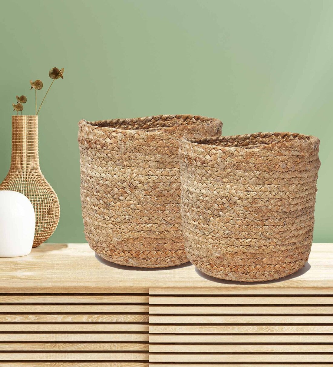 Set Of 2 Beige Jute Handwoven Multipurpose Planter & Storage Basket