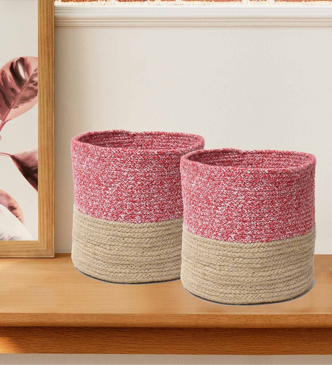 Set Of 2 Pink & Beige Jute Handwoven Multipurpose Planter & Storage Basket