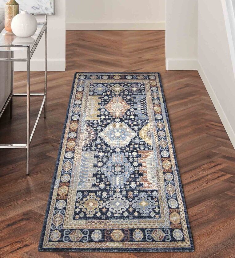 Navy Blue Abstract Polyester 59x32 Inches Machine Made Floor Runner
