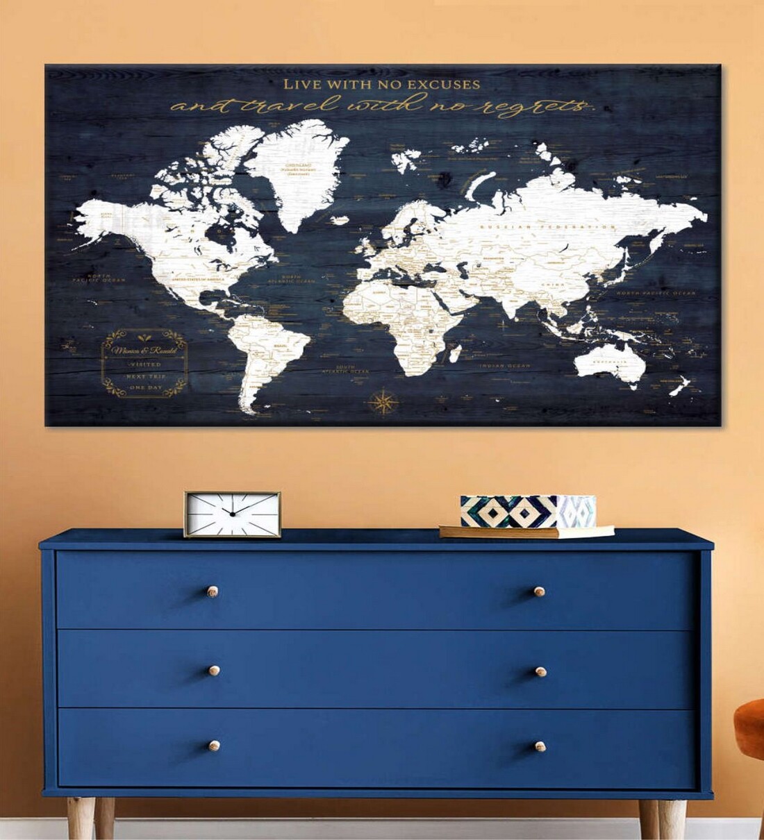 POSTERS AND TRUSS Navy Blue & White World Map Printed Wall Art