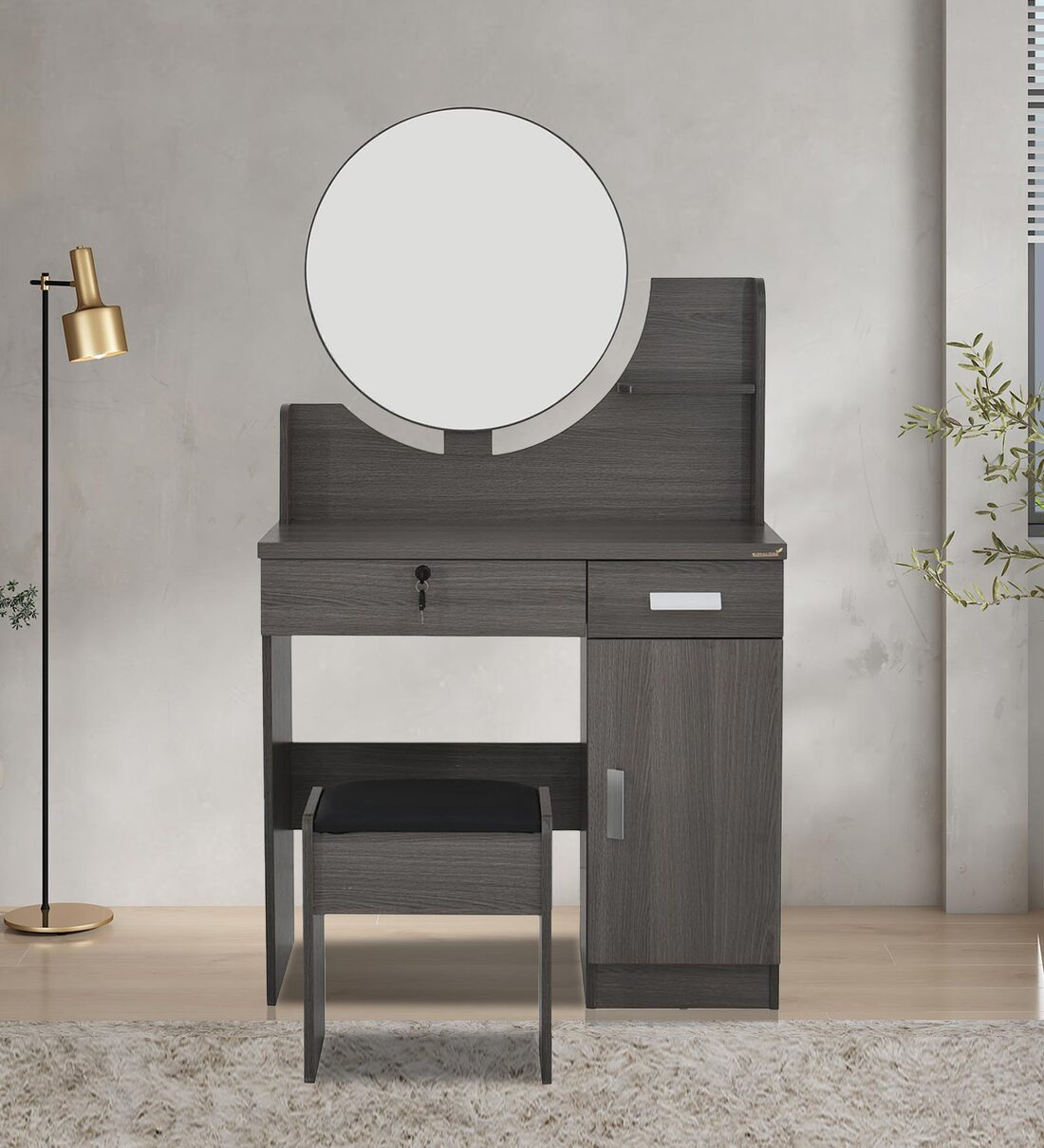 Tivoli Italian Dressing Table, a perfect combination of style and functionality for your bedroom. Crafted from high-density fiberboard (HDF) with a sleek melamine finish, this designer dressing table for home radiates modern elegance and durability. The telescopic channels ensure smooth and effortless drawer operation, while the soft-closing hinges add a touch of luxury to your daily routine. The set includes a matching stool for added convenience, and the round mirror completes the ensemble, providing an ideal space for your grooming rituals. With a safety lock for the drawer, this modern dressing table for home offers both practicality and security, making it an essential addition to your bedroom decor.