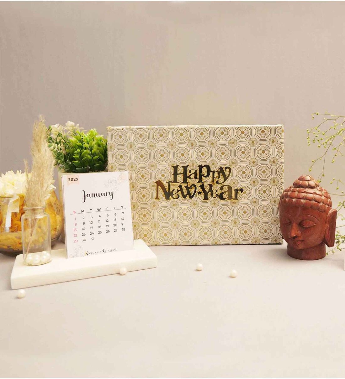 Celebrate the New Year with our exclusive Indian Handicrafts Gift Hamper, featuring a beautifully crafted 2025 calendar and a serene Buddha head statue. This unique gift set blends tradition and tranquillity, making it the perfect choice for spreading peace and positivity in the new year. Thoughtfully designed, it combines the elegance of Indian craftsmanship with a practical calendar, creating a meaningful and stylish gift for clients, employees, or loved ones. Embrace the spirit of the new year with this timeless, handcrafted gift set!