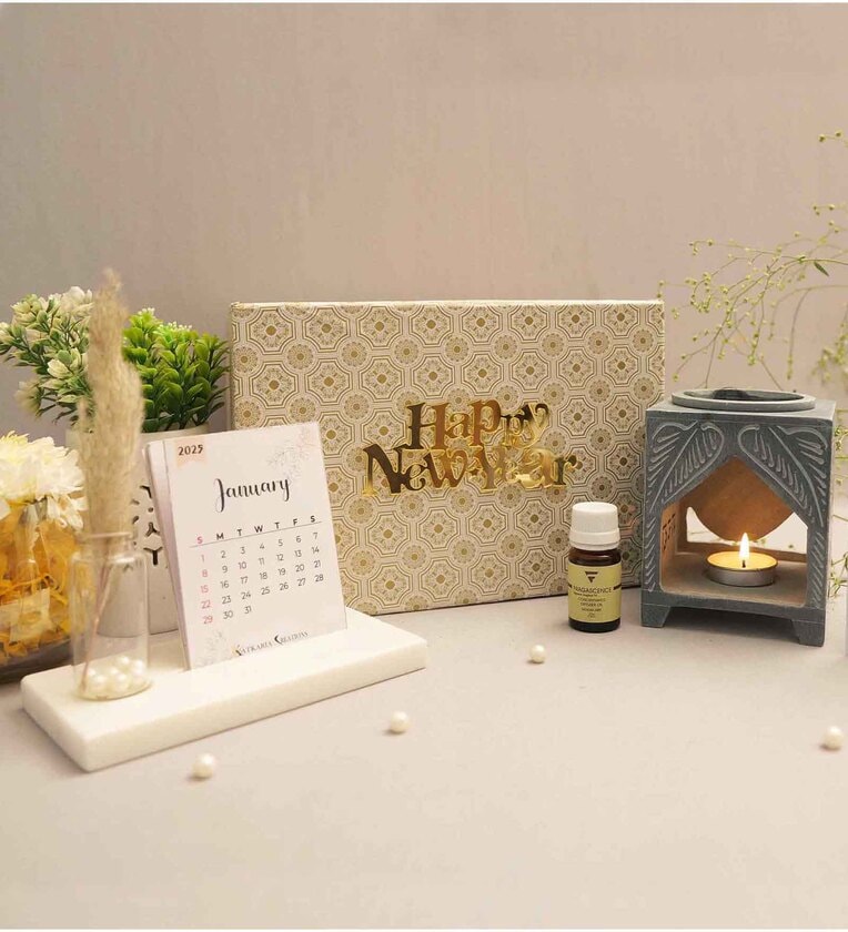 New Year Gift Hamper With 2025 Desk Calendar & Buddha Oil Diffuser
