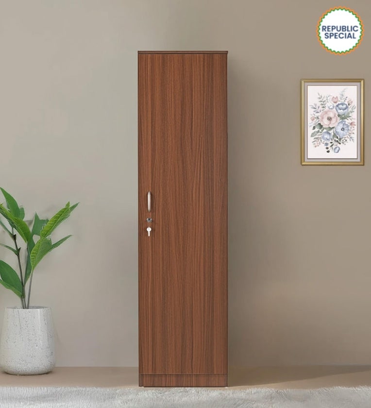 The single-door structure makes it ideal for smaller spaces, maximising storage efficiency|Includes four compartments and one drawer, offering plenty of space for clothes and accessories|Suitable for bedrooms and guest rooms offering practical storage without taking up much space|Lockable door provides added security and the rich walnut finish complements various decor styles|Made from high-quality engineered wood, ensuring lasting durability and stability