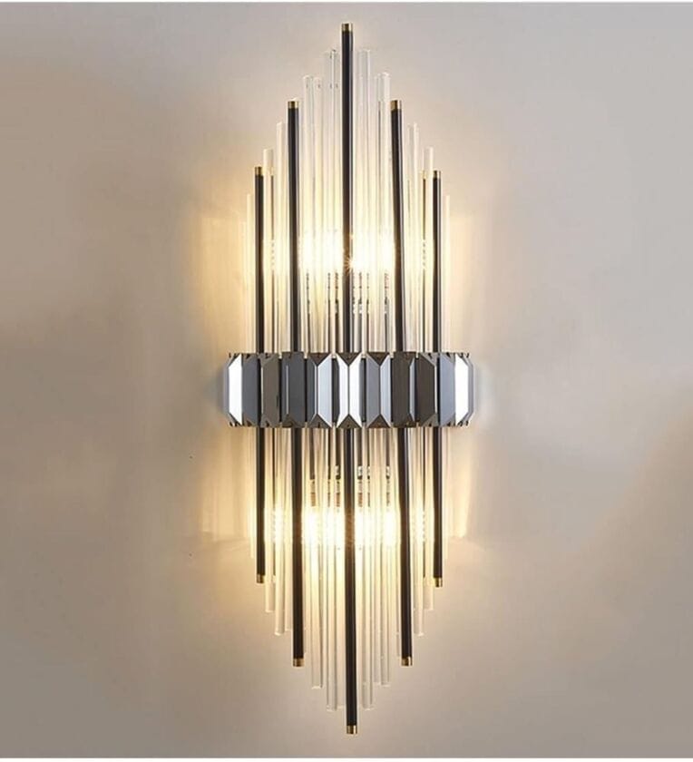 Make a bold statement with the Nova Luxe Crystal Wall Light, featuring layered glass rods and a sleek metal centerpiece in a striking geometric form. This modern Art Deco-inspired sconce brings sophistication and radiant elegance to hallways, living rooms, or luxury bedrooms. The tiered design emits a warm, ambient glow while creating a dramatic visual impact on any wall.