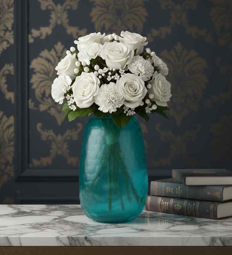 This luxury glass vase features a frosted turquoise finish with a textured honeycomb pattern, radiating modern elegance. Its contemporary design adds a pop of color and sophistication to any space.