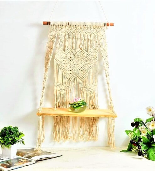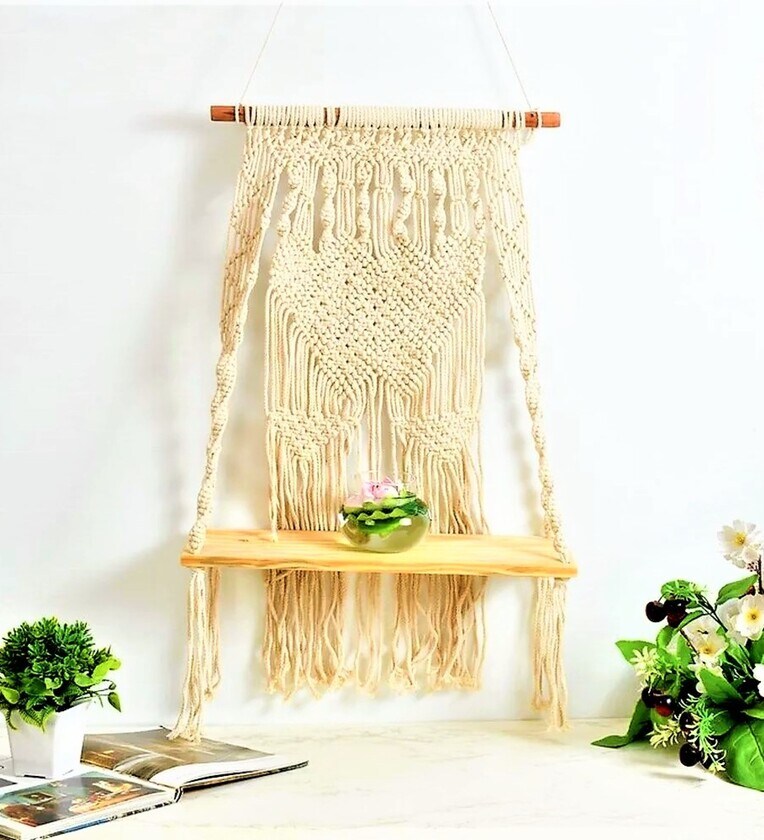 A beautiful macram wall hanging shelf for that minimalist look, handmade by our local artists. It's simple yet elegant, use it to hang your favorite decor items or planters indoor or outdoor.Handmade in IndiaDelivery with a special packagingCan be easily hung with nails on the wallSize: 19 x 6 x 39 inches (approx)Color: Off-WhiteMaterial: Macrame. woodPattern: DiamondPlants, planters and accessories are not included in the package. They are only for representation purposeMacrame is dyeable, so you can even dye it in your desired colorWhere can you use it:Can be used in your living room or bedroomCan be hung on your office wallsCan be used for gifting purposeCaring instructions: Mild wash for the macram. Dry cloth cleaning for the wooden part of the itemNote: There might be a slight variation in the shade of the actual product and the image shown on the screen, due to the screen resolution and photography effects.