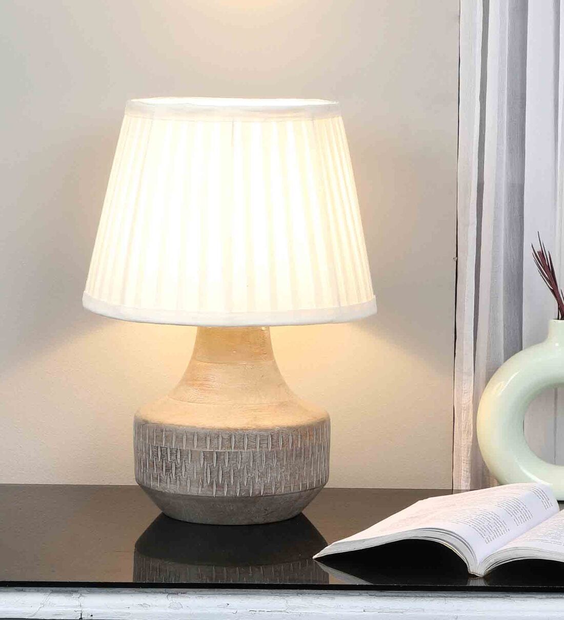 Off White Satin Shade Table Lamp With Mango Wood Base