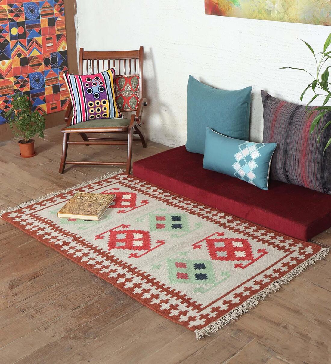 This attractive multicoloured dhurrie adorn with a geometric pattern all over gives your home a classy look. This 3X5 feet Dhurrie is made from 100 % woollen with hand woven technique.