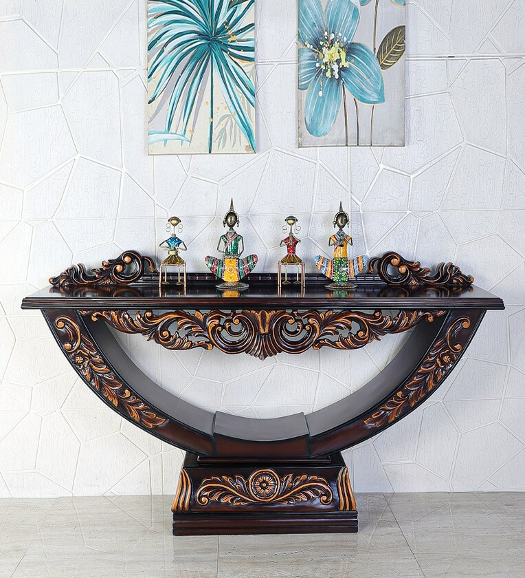 A Console Table is wide, shallow and roughly as tall as a regular table or desk which sits up against a wall. The average console table height is 30 inches, though designs can range anywhere from 28 inches to 32 inches in height.