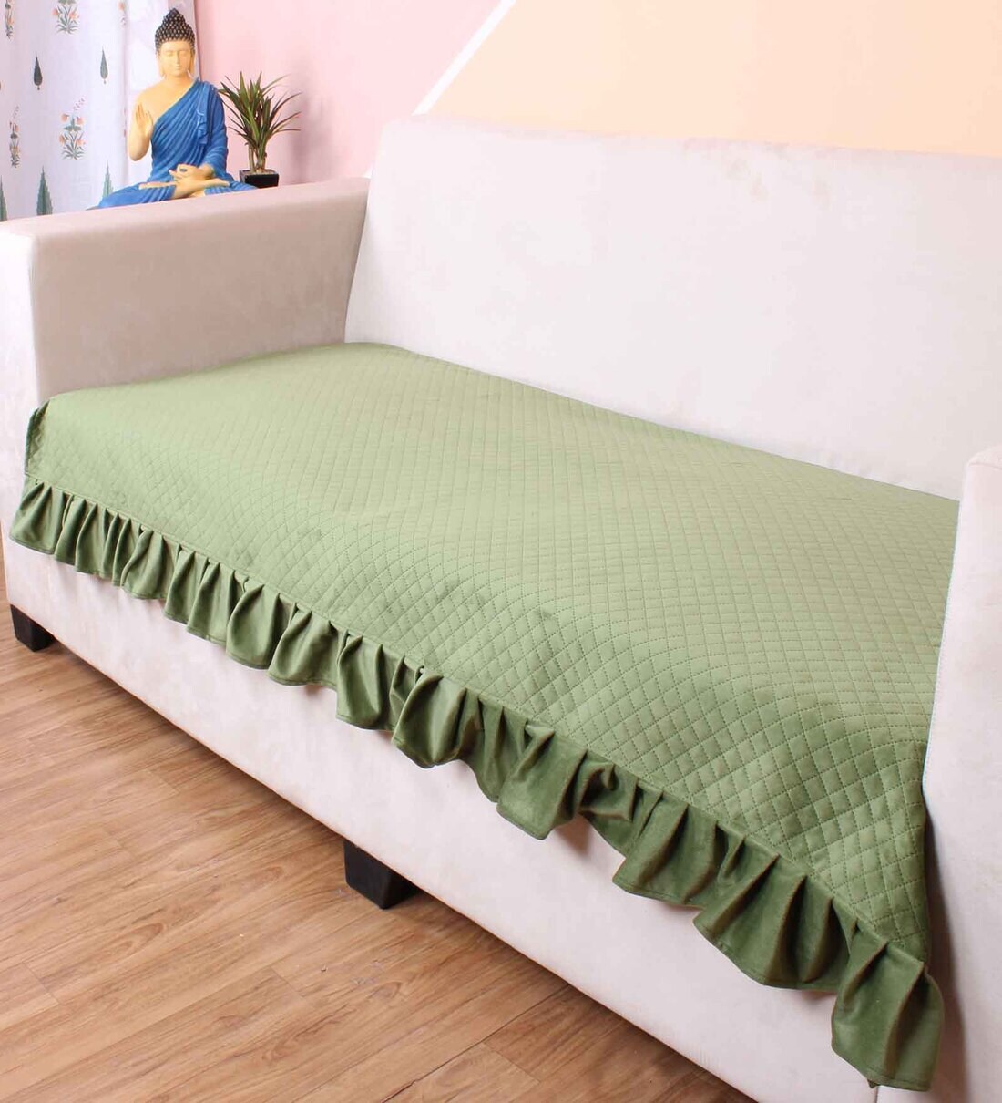 Olive Solid Velvet 2 Seater Quilted Sofa Cover (Protector) with Frill