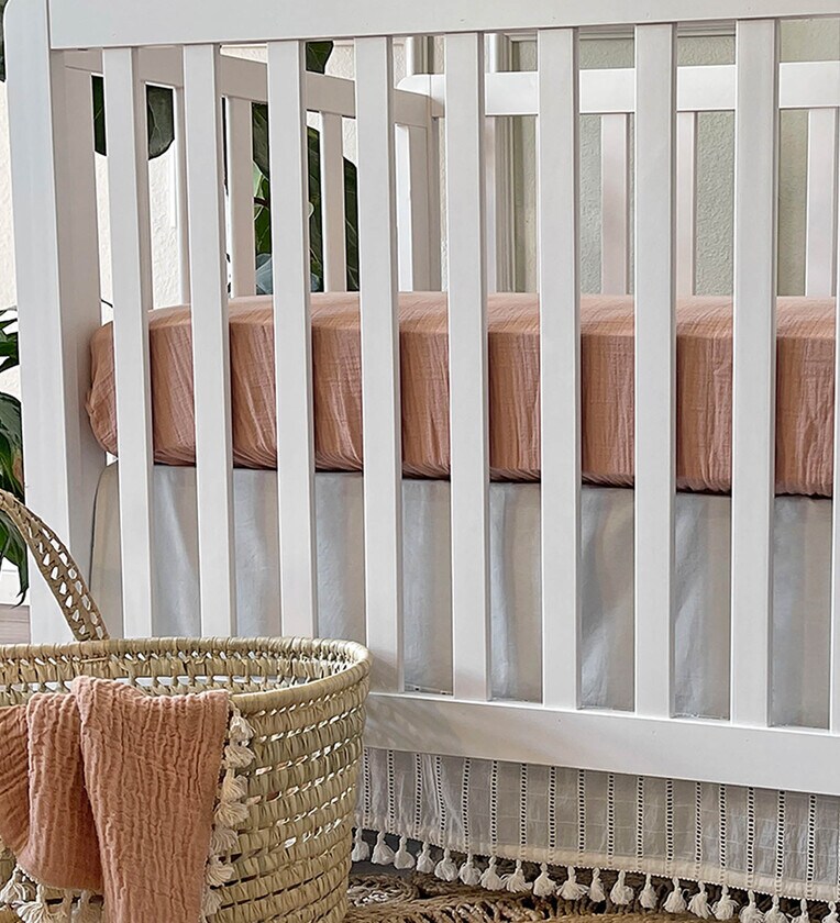 Dress your baby's crib in the comfort of 100% cotton muslin. Available in a variety of soft + earthy colors including, desert rose, copper, ochre, evergreen and riverstone. Crib sheets are the perfect way to add pops of color to your nursery. Cotton muslin is breathable and softens with every wash. Packaged in a fabric bag you can reuse to keep your baby essentials neat and tidy.
