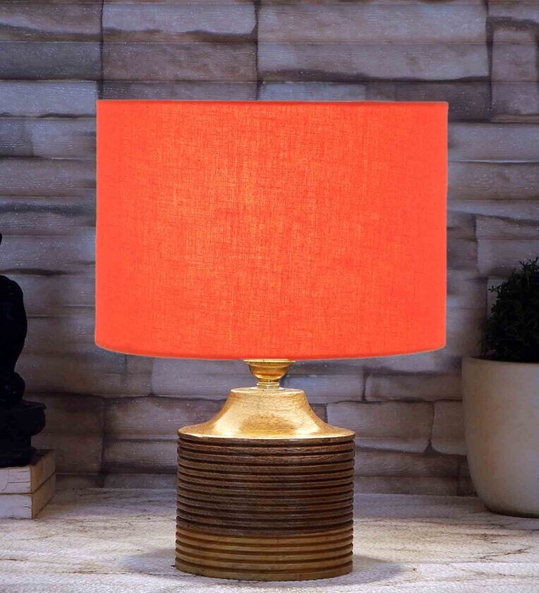 Orange Shade Table Lamp With Wood Base